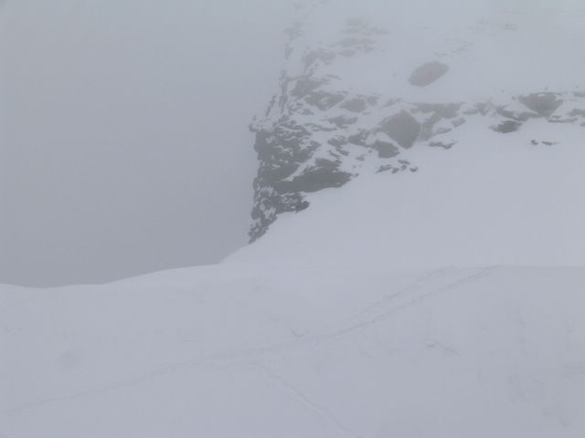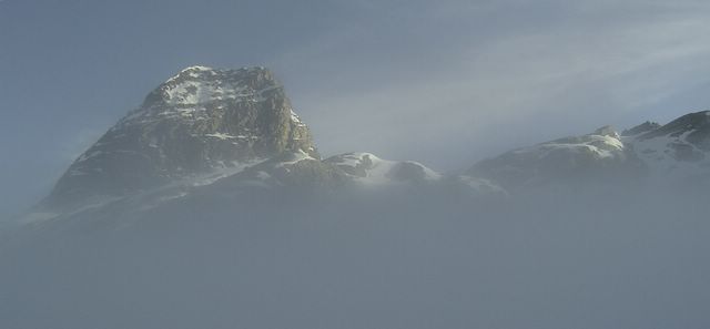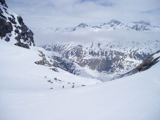 Dans l’élan on remet ça le jour suivant, départ 5h30..mais il pleut. « Pas grave, plus haut il neigera sûrement ». On monte donc vers l’Iseran, au début ski sur le sac..mais il pleut. « Pas grave, plus haut il neigera peut être », on met les peaux et on se dirige vers le couloir d’accès à la Pointe la Met, il neige
