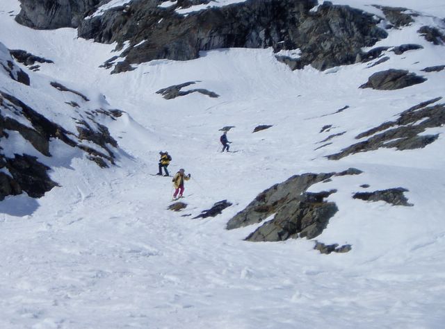 Les vrais vosgiens nous sortent le grand jeu, affirmant que la neige est excellente. On ira quand même pas en redemander. Par contre, plutôt sympa l’arrivée quasiment skis au pied jusqu’au village par la route de l’Iseran : le vrai nîmois nous y apprend comment traverser de névés en névés en glissant sur les crottes de chamois, un grand moment de ski…