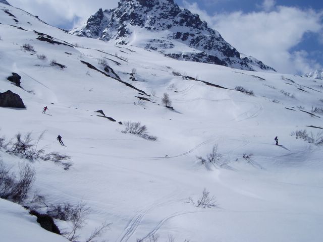 Quelques ronflements plus tard, départ pour la Pointe Francesetti dont les dernières pentes demandent tout de même un peu d’attention. S’en suit une descente assez grandiose jusqu’au hameau de l’Ecot, puis une bonne séance de ski-route jusqu’à Bonneval.