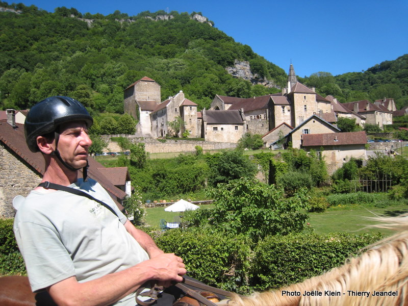 Pour cette première journée, Jean Louis, notre hôte, un amoureux des chevaux, du Jura, et des chevaux jurassiens que sont les représentants de la race comtoise, nous avait préparé une jolie boucle d’une trentaine de kilomètres à travers la campagne environnante. Boucle d’autant plus intéressante qu’elle permettait aux cavaliers, aux vélos, petits et grands, et même aux coureuses d’antiquaires de se rejoindre pour le casse croûte de midi au bord de la cluse qui domine Baume les Messieurs, un endroit magnifique.