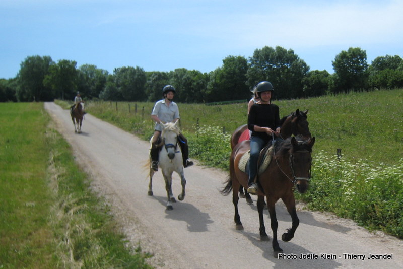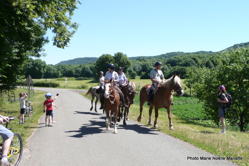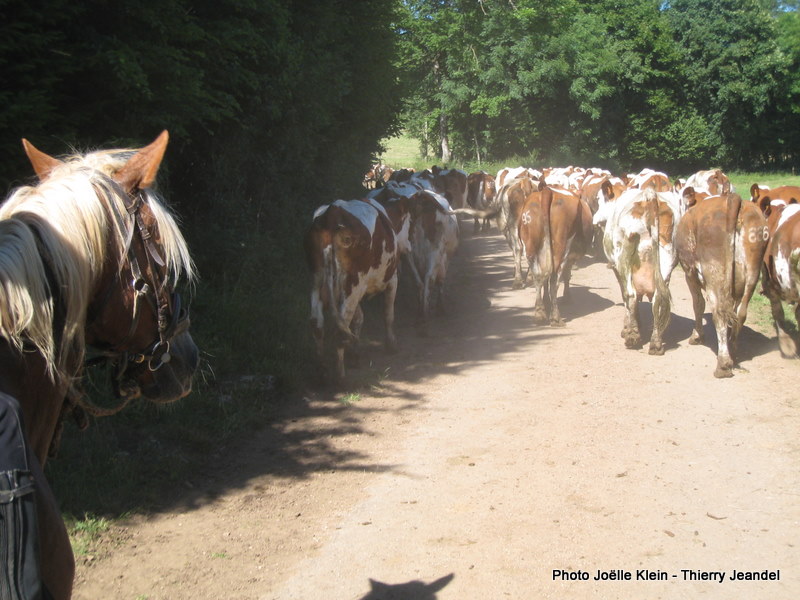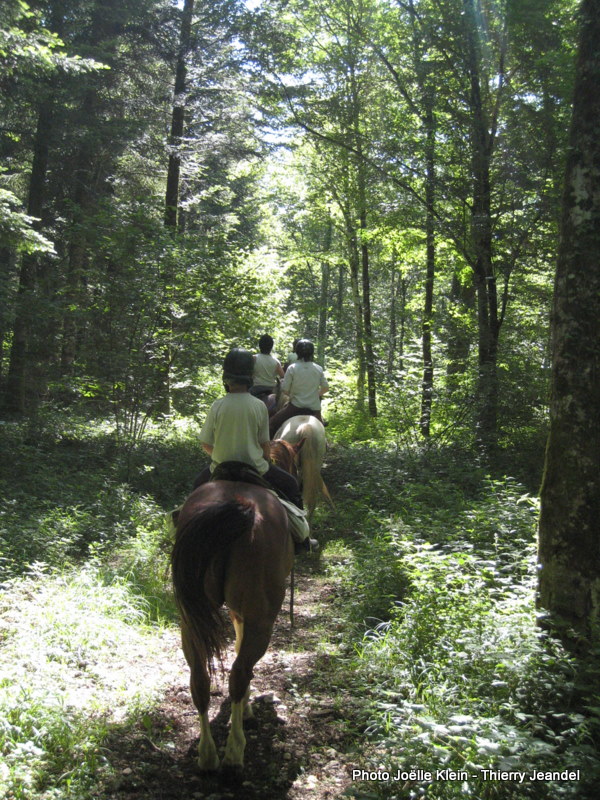 C’est là qu’on les a vu arriver côte à côte, Carla et Sarko, le plus simplement du monde. On confia Carla à Joëlle et Sarko à Marie Noëlle qui se fit tout de même un peu prier pour monter sur son dos, allez savoir pourquoi… Ensuite direction la forêt jurassienne. « Je vais quand même venir avec vous, car avec les deux là on ne sait jamais » avait dit notre hôte Jean Louis.
