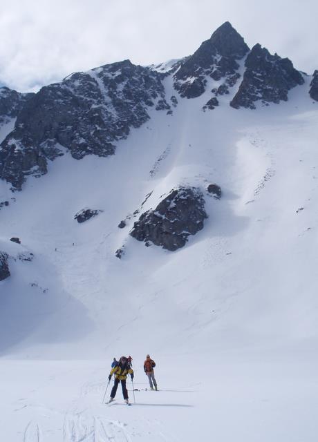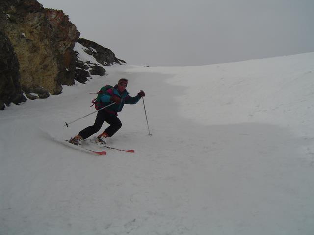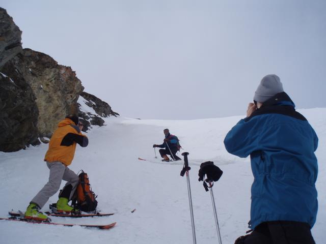 DSC05560Le lendemain matin nous voilà donc au pied du Galehorn qui bien que moins prestigieux que le Breithorn a le mérite de ne pas « être en glace bleue ». A la montée, Daniel, toujours à la recherche d’une animation possible, laisse son appareil photo tout neuf sur une pierre, histoire de se refaire une petite descente supplémentaire. La descente, par l’autre versant de la montagne, un beau couloir bien large, est un vrai régal.