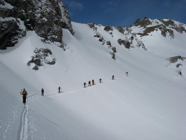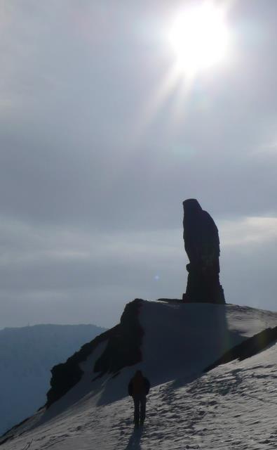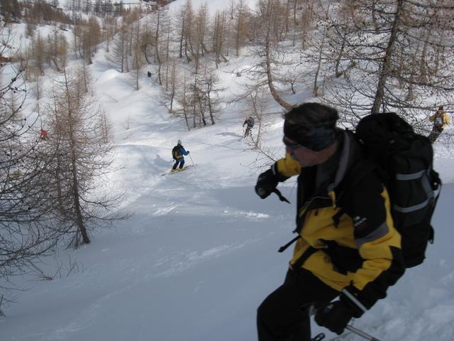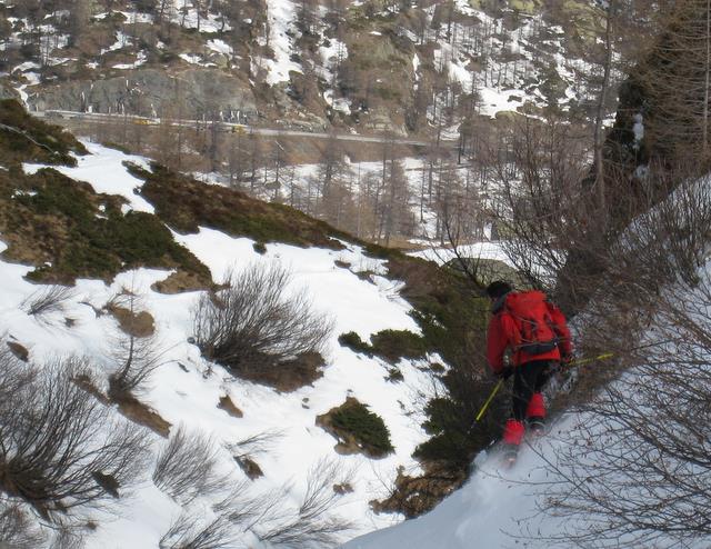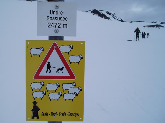 DSC05525Comme le règlement de l’Hospice indique que la matinée doit être consacrée à « la lecture, études ou autres occupations convenables » avec « défense de s’exposer dans les précipices », la destination de la première journée fut le modeste Spitzhorli, 800 mètres de dénivelé, un coup sans couteaux, un coup avec couteaux, un coup les skis aux pieds, un coup les skis sur l’épaule avec au passage révision des panneaux de signalisation « pastorale » et croisement au sommet d’un groupe goguenard à pied qui nous regarde vouloir absolument skier la plaque de glace en contrebas.