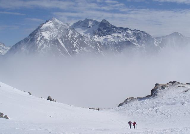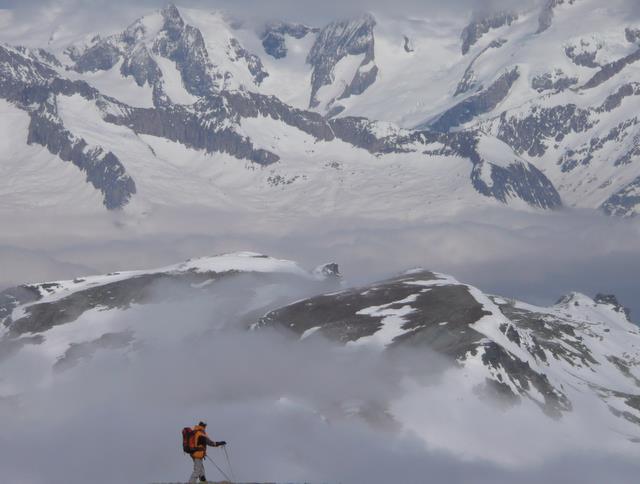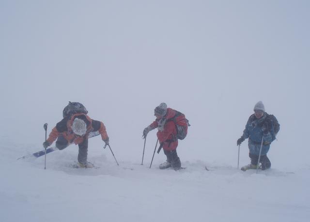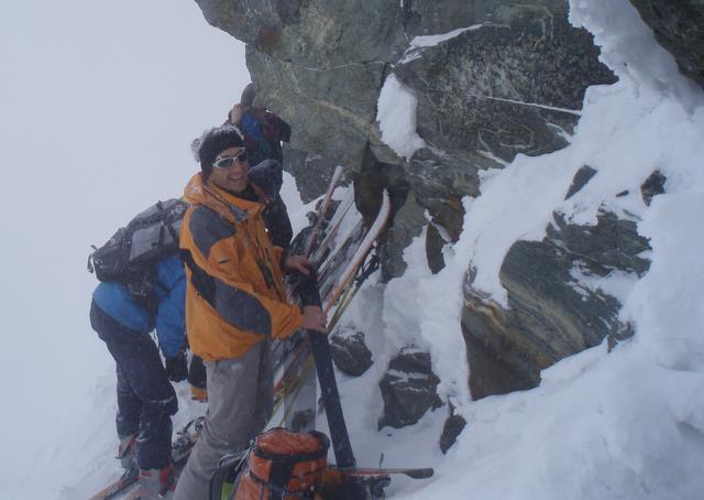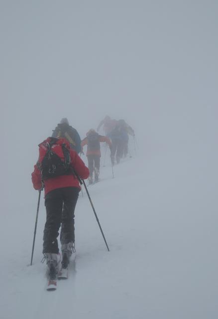 Le dernier jour sera un « GPS Day » c’est-à-dire avec une visibilité oscillant de nulle à mauvaise, sur un bon 1500 m. de dénivelé avec une section bien technique dans de la pente raide parsemée d’arcosses, une neige pleine de surprises, bref tout ce qu’il fallait pour le bizutage de Francis pour qui c’était le week-end « découverte du ski de randonnée ».