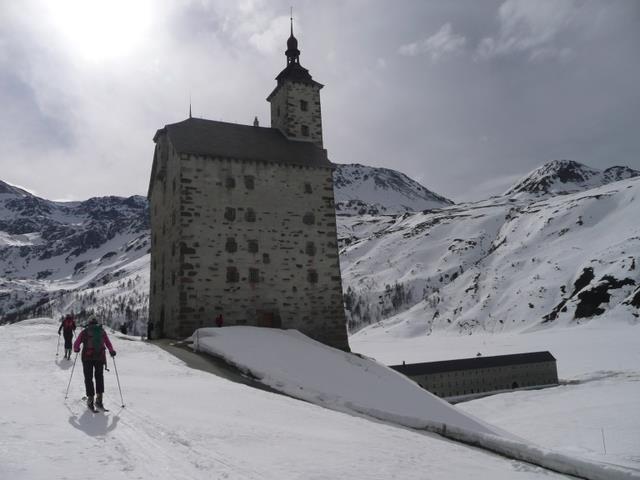 P1010139Notre obstination aura du bon car de plaques d’herbe en plaques de neige pas terribles et de petits couloirs en petits couloirs en presque bonne neige nous arriverons en vue de l’Ancien Hospice et d’une curieuse chapelle à 8 étages au pied de laquelle nous finirons l’après midi au soleil.