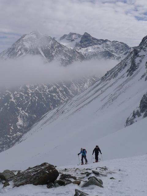 Le lendemain matin nous voilà donc au pied du Galehorn qui bien que moins prestigieux que le Breithorn a le mérite de ne pas « être en glace bleue ». A la montée, Daniel, toujours à la recherche d’une animation possible, laisse son appareil photo tout neuf sur une pierre, histoire de se refaire une petite descente supplémentaire. La descente, par l’autre versant de la montagne, un beau couloir bien large, est un vrai régal.